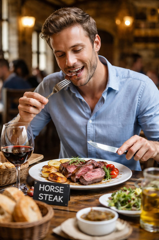 "... A muscular, robust adult brown horse standing proudly, its forelegs heavily pressing between the shoulder blades and spine of a reclining man ... and its eyes sharp and focused, exuding a primal sense of power. The subdued man is a white male, 30-40 years old, his face covered in dust and sweat ... his body is in a push-up position—his palms are pressed hard against the cracked, dry earth, his knuckles white, the veins in his arms bulging, his legs stretched straight back and taut, his toes digging into the ground, his entire torso trembling slightly from the weight ..."